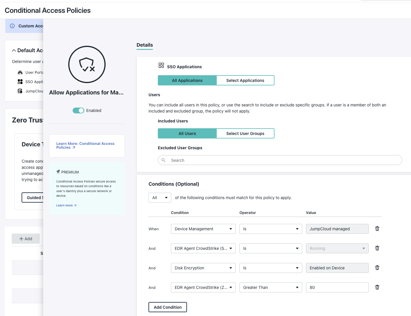 Conditional Access allows an IdP to bind authorization to more parameters than just a correct password and MFA. For example, it also takes into account device status and context. Jumpcloud now allows you to do this in conjunction with CrowdStrike. How this works and all the details below.